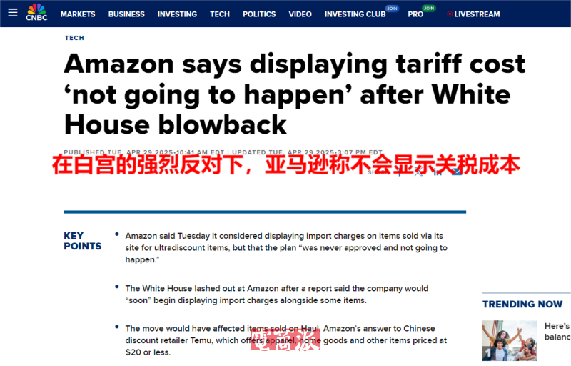 亞馬遜標(biāo)注關(guān)稅成本計(jì)劃被反對(duì) 圖源:CNBC