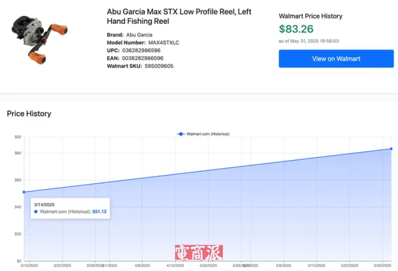 一些三方網(wǎng)站的跟蹤數(shù)據(jù)顯示,從4月至5月,沃爾瑪確有不少商品都出現(xiàn)了較大的價(jià)格漲幅。比如霸王龍玩具價(jià)格從39.92美元上漲55美元,漲幅接近38%;一款左手漁線輪價(jià)格從57.37美元漲到了83.26美元,漲幅高達(dá)45%。