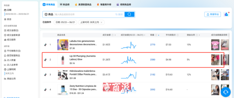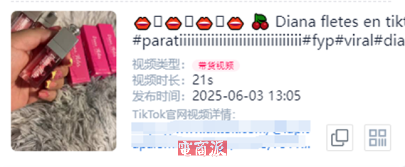 權威機構數據顯示,近日,主營美妝個護品類的店鋪Diana Fletes Cosmetics旗下的一款名為Lip Oil Plumping(Aumenta Labio)Glow的豐唇油,在TikTok墨西哥站點突然爆火,上架不足一個月就賣出了2580支,靠著不到5美元的價格,拿下了近25萬墨西哥比索的總銷售額(約合人民幣9.1萬元)。