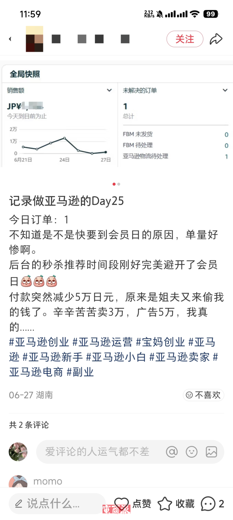 不僅如此,有賣家曬出單量掛零的后臺截圖,很是心酸。甚至還有賣家剛剛完成備貨,滿心期待著大促能帶來豐厚回報,卻沒想到單量不升反降,直至周日完全歸零,“廣告銷售成本蹭蹭往上漲,銷量卻一跌再跌,每天打開后臺看訂單,都需要鼓起莫大的勇氣,6月的銷量差到讓人懷疑人生。