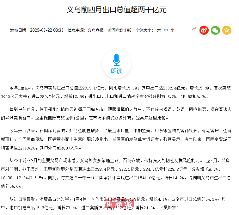 前4月義烏出口總值突破2000億元 圖源:義烏市政府