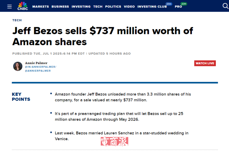 7月2日消息,根據(jù)周二提交給SEC的一份文件,亞馬遜創(chuàng)始人杰夫·貝索斯過(guò)去幾天出售了超330萬(wàn)股亞馬遜股票,價(jià)值約7.37億美元(合52.81億元人民幣),這是他今年首次出售亞馬遜股票。此次股票出售是貝索斯3月份采取的一項(xiàng)預(yù)先安排的交易計(jì)劃(即10b5-1交易計(jì)劃)的一部分。根據(jù)這一安排,貝索斯計(jì)劃在截至2026年5月29日的一段時(shí)間內(nèi)出售2500萬(wàn)股亞馬遜股票。在此次出售后,貝索斯仍持有約9.05億股亞馬遜股票。