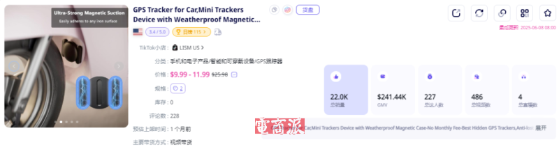 不久前,就有一款迷你車載GPS定位器突然爆火。據了解,這款迷你車載GPS定位器體積小巧、方便安裝,能夠實時追蹤車輛的位置信息,它通過與手機APP連接,用戶可以在手機上隨時隨地查看車輛的位置、行駛軌跡等信息。Echotik數據顯示,該定位器單周銷量超過1萬件,銷售額超11萬美金,增長十分驚人。