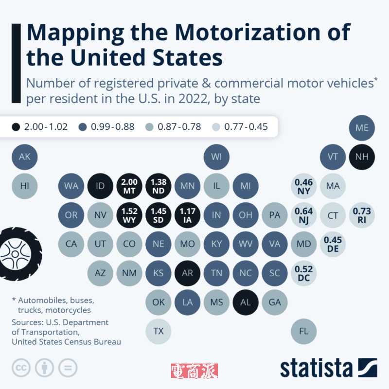 Statista數據表明,機動車擁有量與該州規模、公共設施完善程度有關,一般規模較大的州人均機動車持有量更大。歸根結底就是一句話:汽車早已成為大部分美國人生活中的剛需。