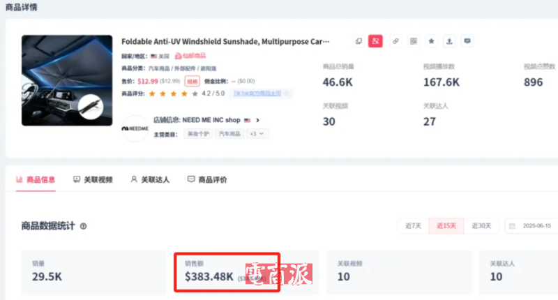 近期,一款售價12.99美元的可折疊汽車遮陽板在TikTok Shop美區持續走熱,近半月銷量逼近3萬件,銷售額突破38萬美元。