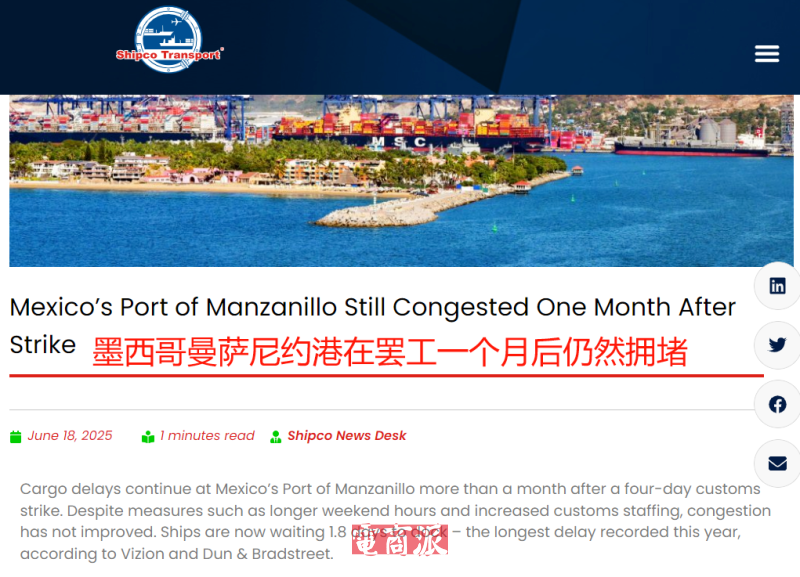 而這僅僅是歐洲港口擁堵的冰山一角。實際上,港口擁堵的問題并非僅僅局限于歐洲。在地球的另一端,墨西哥的曼薩尼約港同樣深陷困境。