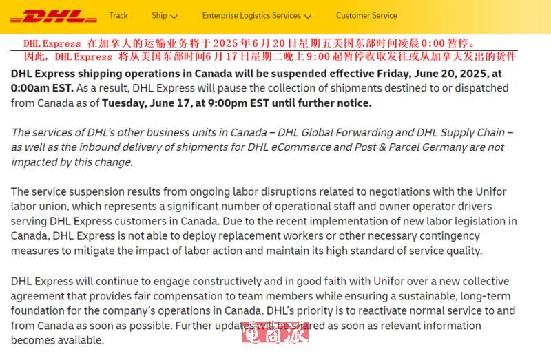 在物流方面,除了歐洲港口的嚴重擁堵,全球范圍內的物流難題也接踵而至。加拿大DHL因合同談判停滯、勞工糾紛等問題,于2025年6月20日暫停在加拿大的運輸業務,6月17日晚9點起已暫停收取發往或從加拿大發出的貨件。所幸的是,這場風波得到了及時解決,DHL已于6月30日起恢復了所有運營。盡管如此,物流中斷的事實已經發生,多多少少還是對賣家的銷售環節造成了一定的影響。?
