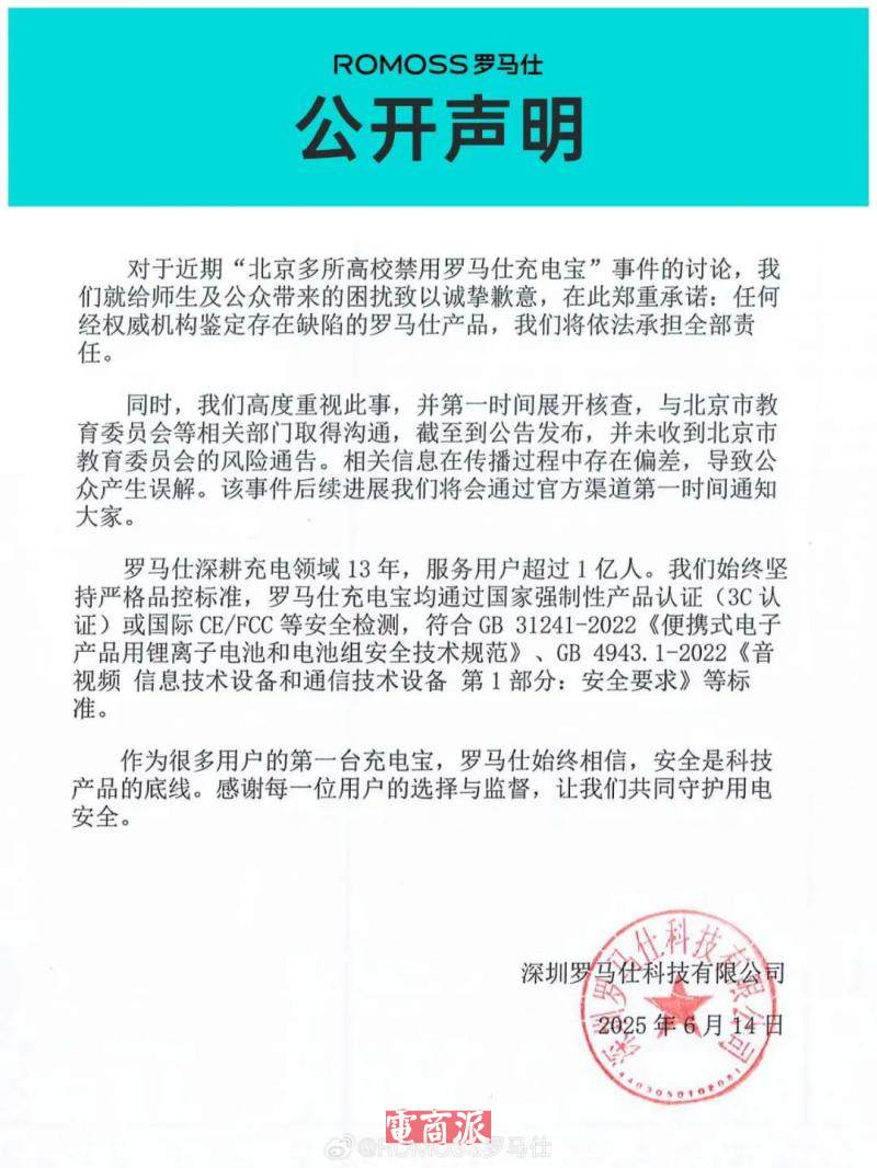 先是因產品質量問題被多所高校通知禁用,6月初北京多所高校保衛處發布通知,直指20000毫安的羅馬式充電寶在充電時更容易發生爆炸現象,威脅學生的用電安全,學校出于安全考慮,將其列入禁用名單。