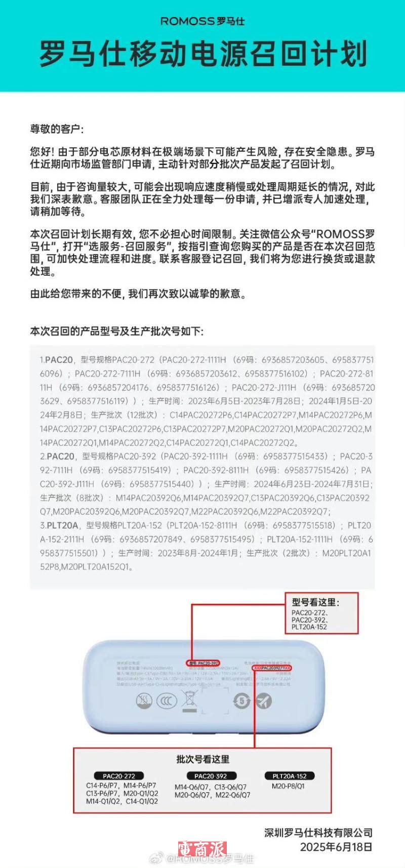 而本次之所以會傳來“倒閉”這樣的消息,還要從上個月羅馬仕宣布召回一批充電寶說起。6月16日,羅馬仕發布公告宣布召回2023年6月5日至2024年7月31日期間生產的三款型號移動電源,原因是電芯原材料來料的原因,可能導致極少數產品在使用中過熱,甚至在極端場景下產生燃燒的風險,存在核心安全隱患。