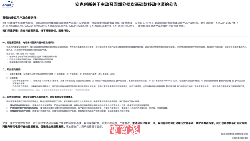 安克創新主動召回部分充電寶公告?圖源:安克創新