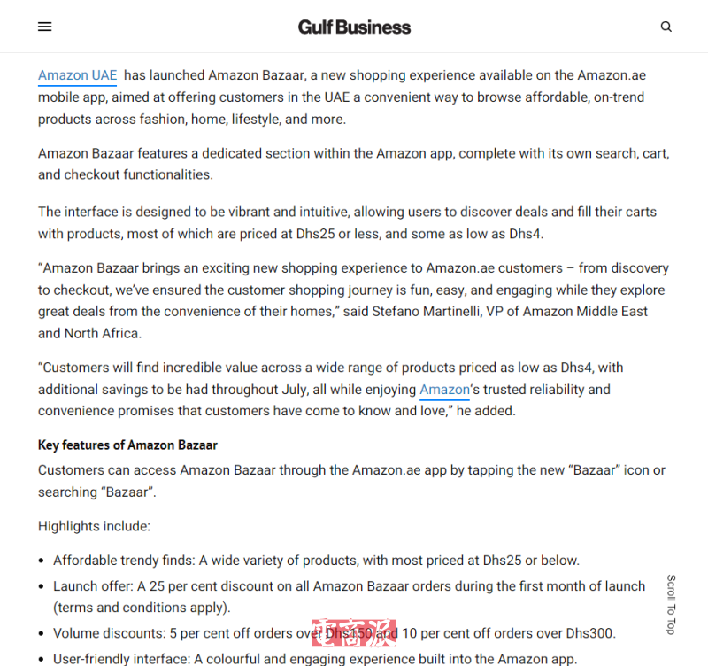 此次推出Amazon Bazaar專區(qū),亞馬遜不僅在中東市場(chǎng)加快本地化進(jìn)程,也在快遞速度、價(jià)格、用戶界面及購(gòu)物體驗(yàn)等方面拉開與傳統(tǒng)電商和本地零售商的差異化競(jìng)爭(zhēng),力圖在阿聯(lián)酋電商市場(chǎng)中建立更強(qiáng)勢(shì)的存在。