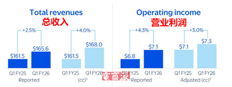 好消息是,目前線上業務已成為沃爾瑪重要的增長引擎。從其不久前公布的財報來看,在2026財年一季度總收入為1656億美元,同比增長2.5%,這也是其在美國和全球電商業務首次實現季度盈利。