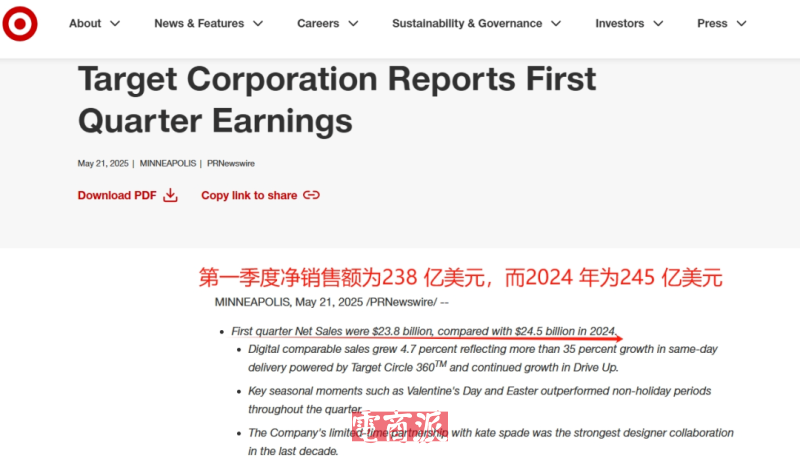 同樣從財報來看,今年一季度塔吉特第一季度營收為238億美元,同比下降2.8%;營業利潤為15億美元,同比增長13.6%。盡管營收未達預期,但線上銷售額增長了4.7%,并且Target Circle 360的當日送達服務也同比增長了36%,這都是一些積極的信號。