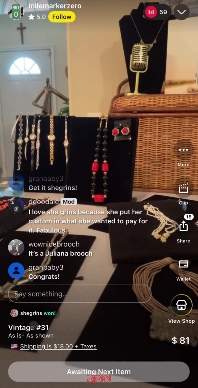 賣家直播銷售首飾 圖源:Whatnot