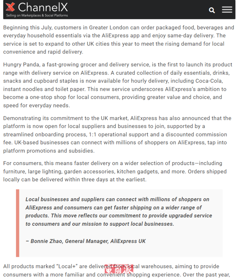 速賣通英國總經理趙晨(Bonnie Zhao)表示:“本地企業和供應商可通過速賣通連接數百萬消費者,而消費者能享受更豐富的商品選擇和更快的配送服務。這一舉措既體現了我們為消費者提供升級服務的承諾,也踐行著扶持本地企業的使命。”