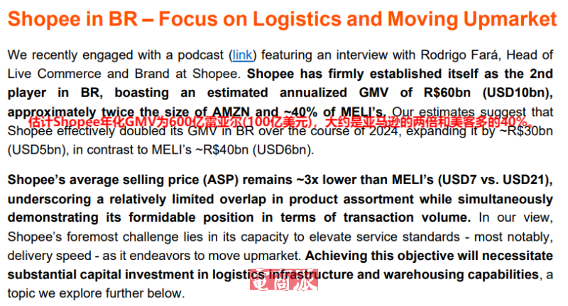 與此同時,Shopee巴西收入也實現新突破。拉美企業投資銀行Itaú BBA的報告指出,2024年Shopee巴西銷售額實現翻倍增長,達到約600億雷亞爾(約合103億美元),是亞馬遜巴西收入的兩倍,美客多巴西的40%。即按收入標準算,Shopee在巴西已經是第二大電商平臺。
