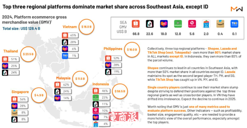新加坡咨詢公司Momentum Work的報告顯示,2024年Shopee依然是東南亞電商市場的主導者,與Lazada、TikTok Shop共同瓜分東南亞超80%的市場份額。其中,按交易額計算,Shopee一家平臺GMV達668億美元,占市場總額的52%;按區域市場劃分,東南亞六國市場里,Shopee的份額排名都是第一。
