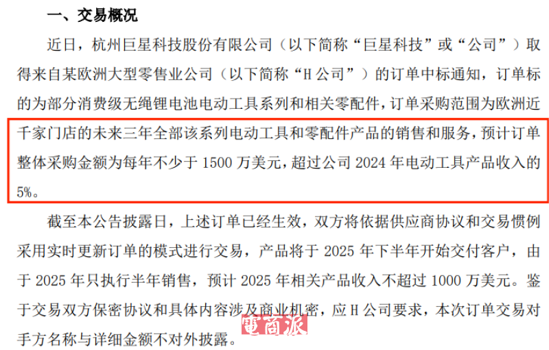 巨星科技拿下歐洲客戶大單 圖源:巨潮資訊