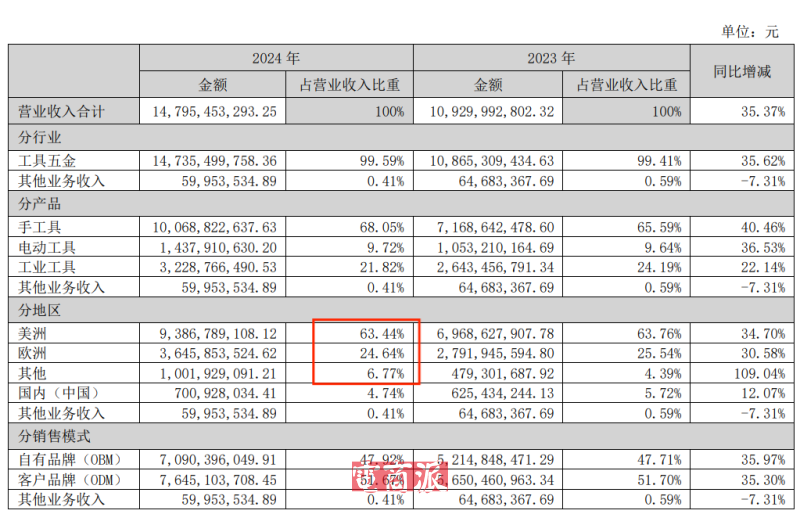 對于一家高度依賴海外市場的企業來說,這個成績足夠亮眼。財報顯示,截至去年底,巨星科技超過90%的收入來自海外市場,其中美洲地區占比最高,超過60%。這意味著,4月特朗普掀起的關稅風暴,也將對巨星科技造成極大沖擊。