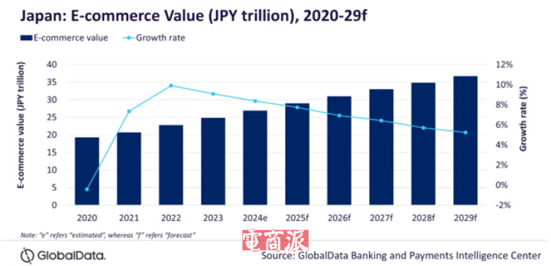 GlobalData的數據就指出,2025年日本電商市場規模將擴大至2068億美元(約合29萬億日元),對比2024年的1919億美元增長7.7%,是僅次于中國和美國的全球第三大電商市場。