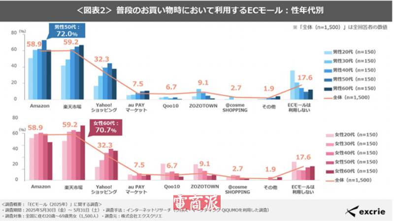 消息顯示,近日,日本EXCREE株式會社通過對日本全國1500名20歲至69歲的男性和女性消費者的研究調查,發布了《2025年電商平臺使用情況報告》,報告顯示,樂天購物和亞馬遜是日本消費者日常購物時最常使用的電商商城,超一半的消費者都對這兩大電商平臺青眼有加。