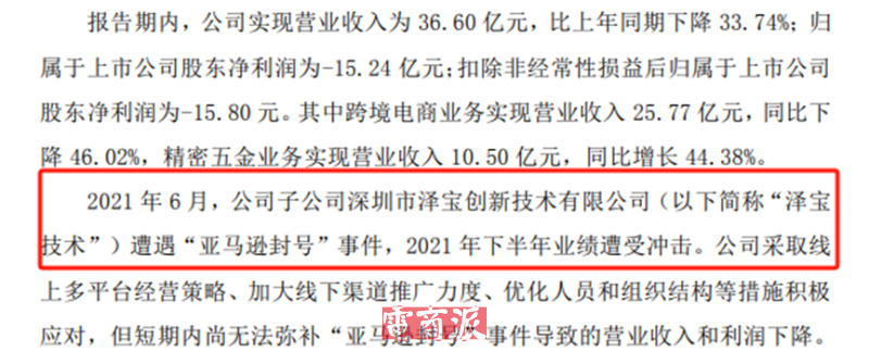 失去了亞馬遜這個主要收入來源,澤寶技術業績暴跌,2021年下半年一度巨虧15億元。
