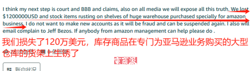 不過,考慮到店鋪被封至今已經帶來了120萬美元的損失(約合人民幣800萬元),并且有大批庫存在亞馬遜倉庫里積灰,ZGh不想輕易放棄,他計劃下一步采取法院訴訟、商業改進局(BBB)舉報、媒體曝光等方式,盡可能挽回自己的損失。