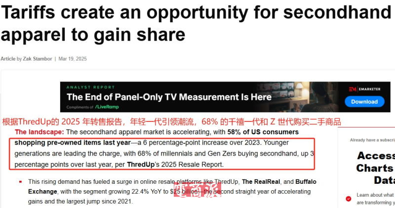 此前,韓國商工會議所對韓國1000名過去一年內有過二手交易經歷的20至50歲消費者進行了一項調查,發布了《二手產品使用情況調查及循環流通事業模式創新報告》。數據指出,有75.3%的受訪者對二手商品交易持積極態度,22.8%的人持中立態度,只有1.9%的人不太接受二手交易。在美國市場,ThredUp《2025年轉售報告》調查指出,68%的Z世代和千禧一代購買二手商品,同比去年增長了3個百分點。