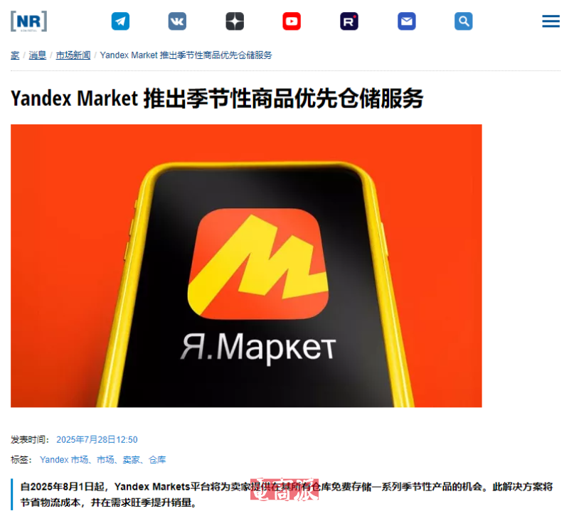 7月30日消息,俄羅斯電商平臺(tái)Yandex Market宣布,自2025年8月1日起,為賣家在其倉儲(chǔ)系統(tǒng)中提供部分季節(jié)性商品的免費(fèi)存儲(chǔ)服務(wù)。該舉措旨在幫助賣家節(jié)省物流成本,同時(shí)抓住季節(jié)性銷售高峰期,提升整體銷售表現(xiàn)。根據(jù)平臺(tái)統(tǒng)計(jì)數(shù)據(jù),夏季用戶對體育用品和園藝相關(guān)商品的需求顯著上升。因此,該類商品的免費(fèi)倉儲(chǔ)服務(wù)將持續(xù)至8月31日,而用于庭院和花園的相關(guān)商品則可享受免費(fèi)倉儲(chǔ)至9月30日。