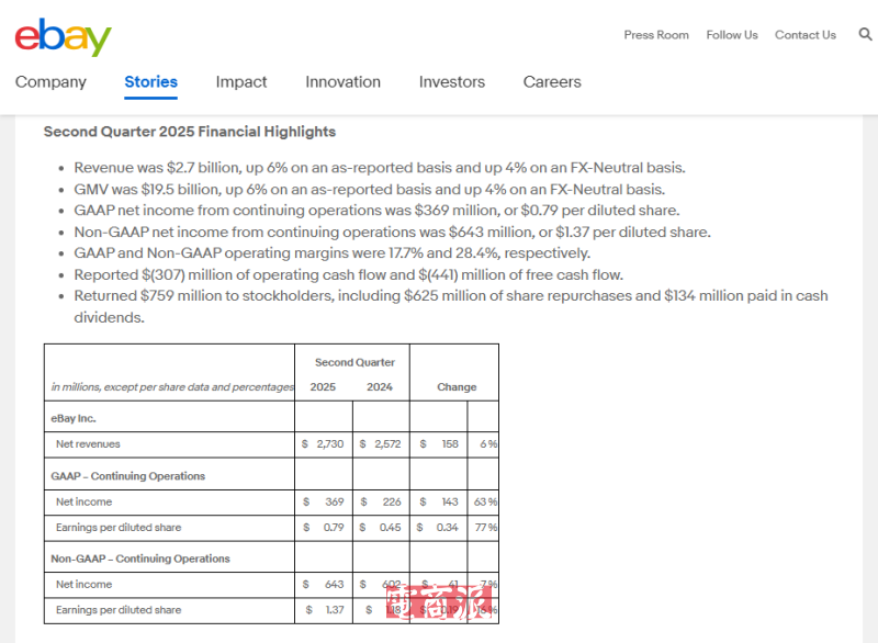 7月31日消息,eBay公布2025年第二季度財務業績。報告顯示,eBay二季度總營收為27億美元,同比增長6%;商品交易總額(GMV)達195億美元,同比增長6%;持續經營業務的GAAP凈利潤為3.69億美元,GAAP經營利潤率為17.7%;Non-GAAP凈利潤為6.43億美元,Non-GAAP經營利潤率為28.4%。