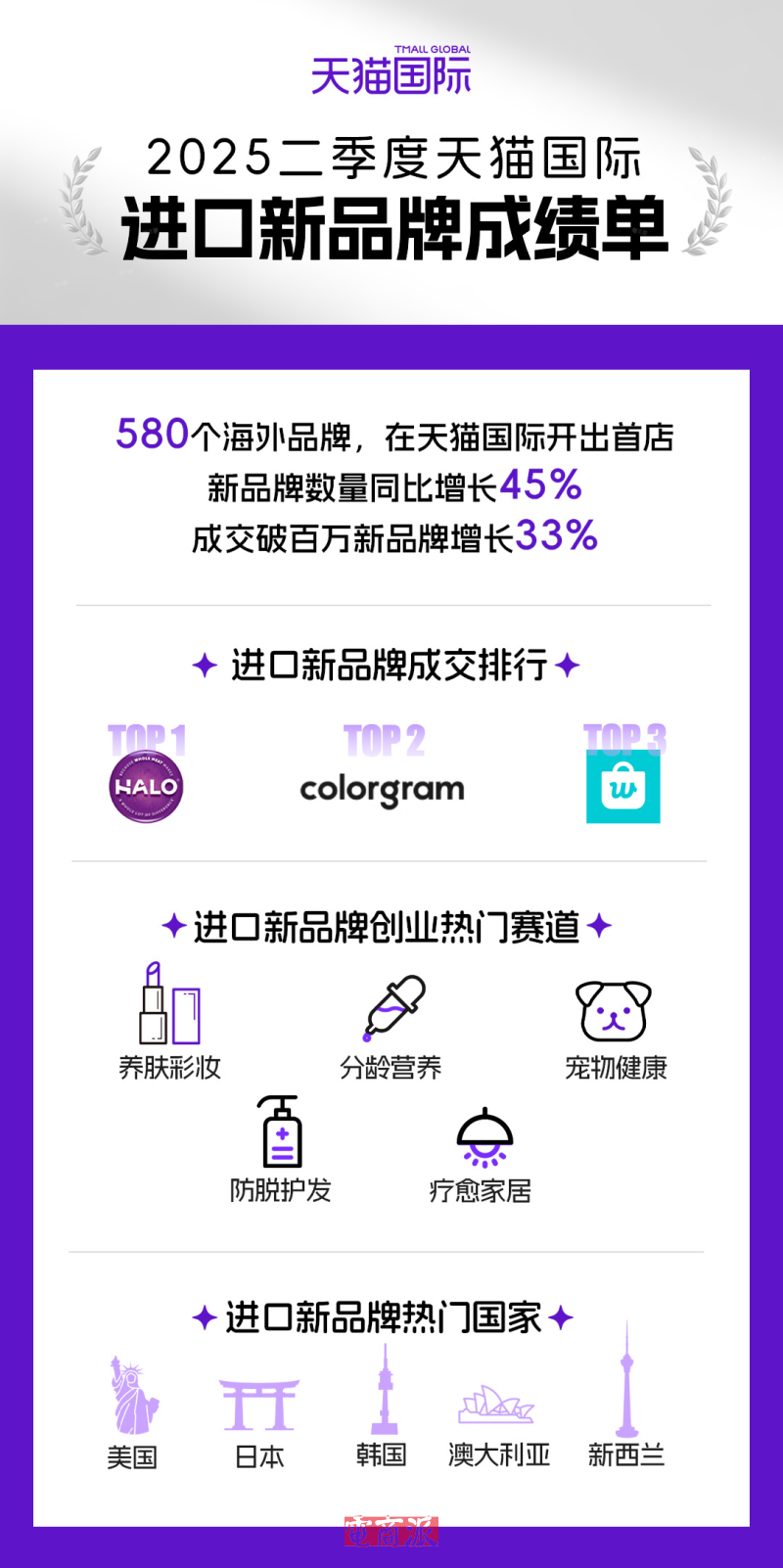 天貓國際的發布2025二季度全球超新星品牌榜顯示,美國寵物品牌Halo自然光環、韓國彩妝品牌Colorgram和K-POP周邊品牌Weverse Shop位列前三。這份榜單基于旗艦店生意規模、品牌影響力、消費者喜愛度三個維度,每季度選出成長迅速的進口新銳“尖子生”。