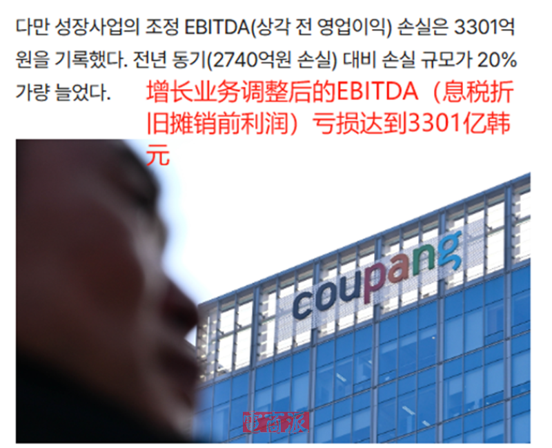 值得注意的是,盡管營(yíng)收利潤(rùn)總體上漲,但Coupang增長(zhǎng)業(yè)務(wù)部門調(diào)整后的EBITDA(息稅折舊攤銷前利潤(rùn))還是虧損了3301億韓元,虧損同比擴(kuò)大了20%。