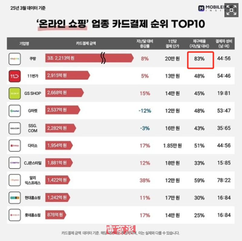 IGA Works Mobile Index發(fā)布的數(shù)據(jù)就顯示,2025年三月,Coupang處理的信用卡和借記卡支付金額約為3.2萬(wàn)億韓元,比排名第二的11 Street(2915億韓元)高出足足八倍,斷層領(lǐng)先。
