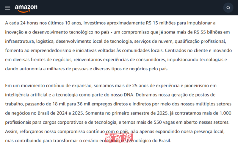 在持續擴展的過程中,亞馬遜加快了本地崗位的創造,從2024年到2025年,直接和間接崗位總數從1.8萬個增長至3.6萬個,僅2025年上半年就在技術和企業職位領域新招錄了逾1000名員工,目前仍有超過550個職位空缺。亞馬遜在巴西的招聘涵蓋多個經濟關鍵領域,包括物流、信息技術及數字娛樂等。