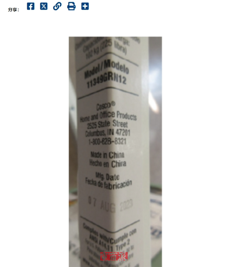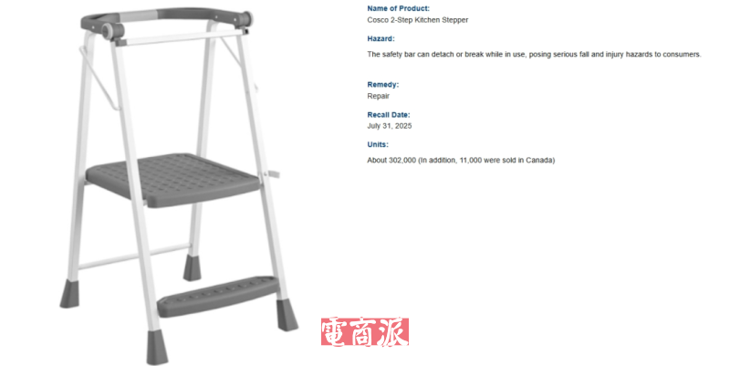 CPSC緊急召回通知顯示,Dorel Home Furnishings旗下品牌Cosco的二階廚房梯子安全桿可能脫落或斷裂,消費者使用時可能從梯子上跌落,存在嚴重安全隱患,全美召回302,000套,加拿大召回11,000套。
