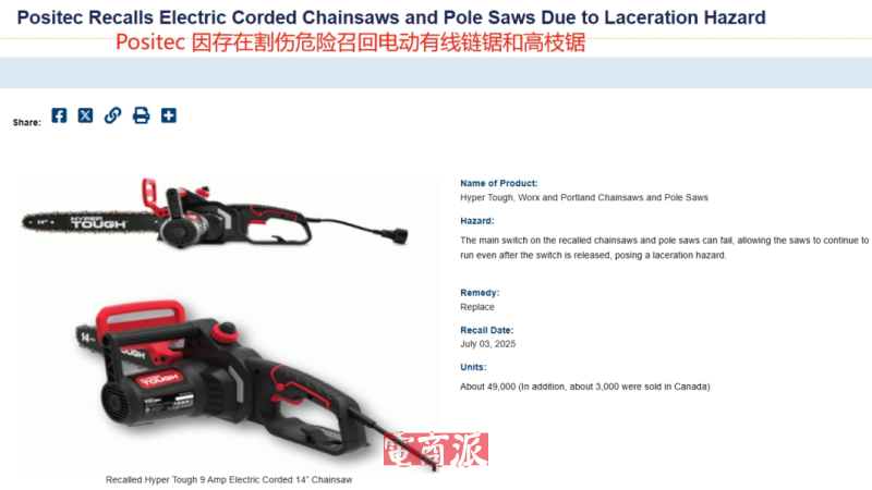 具體來看,此次召回是由Positec主動發(fā)起的,召回品牌及型號包括Hyper Tough(型號HT 21-401-002-01)、WORX(型號WG305/WG309)和Portland(SKU 58949/UPC 193175451774)的電動有線鏈鋸及桿鋸。至于召回原因,是其鏈條制動器存在缺陷,無法及時有效制動鏈條,在使用過程中可能導致使用者受傷。