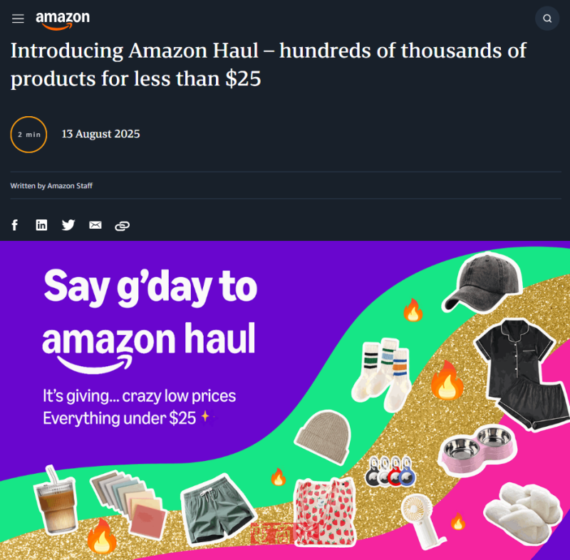 目前,該服務正以測試版形式向部分澳大利亞消費者開放,用戶可在Amazon購物應用中搜索Haul或通過主菜單進入,預計將在未來幾天全面上線。為配合上線,亞馬遜在前兩周為所有Haul商品提供六折優惠,許多商品價格降至10澳元以下,并對超過40澳元的訂單提供額外限時折扣。平臺還規定,符合“改變主意”條件的Haul商品可在15天內退貨。