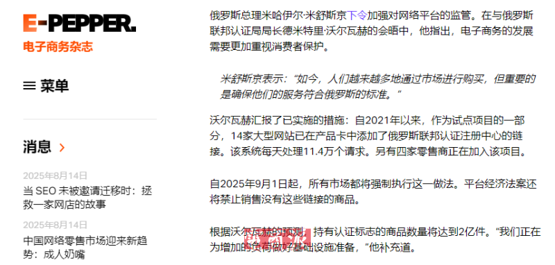 早在2021年,俄羅斯便已開啟電商商品認證信息標注的試點工作。截至目前,已有14家大型電商平臺積極響應,在商品頁面成功嵌入認證鏈接。該系統每日需處理約11.4萬次查詢,足見消費者對商品認證信息的關注度之高。此次俄羅斯強制標注電商商品認證信息的政策,將是對當地消費者權益的一次有力保護,也將推動俄羅斯電商市場更加規范化、透明化。