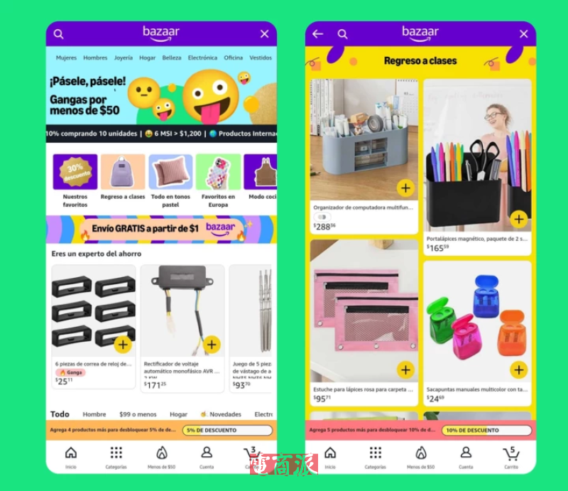 8月19日消息,亞馬遜墨西哥近日在其移動應(yīng)用中推出了低價商店Amazon Bazaar,旨在提供低價時尚、生活方式及實用商品。根據(jù)亞馬遜介紹,Amazon Bazaar匯集數(shù)千種商品,大部分商品售價低于11美元,還設(shè)有一個專門區(qū)域,商品售價均不超過3美元。
