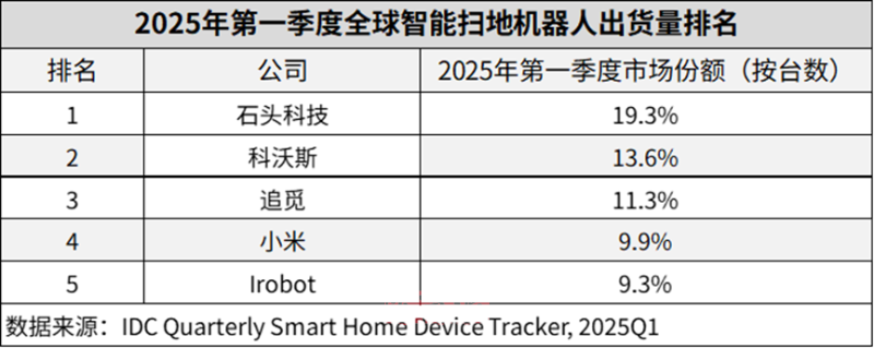 事實也正是如此,在國內市場見頂的情況下,掃地機器人巨頭出海是規模擴張的必選項,?從市場空間的角度看,石頭科技全球化戰略的增長潛力也已經得到驗證。IDC報告指出,今年一季度石頭科技智能掃地機器人出貨量繼續位列全球第一,占據19.3%的市場份額。