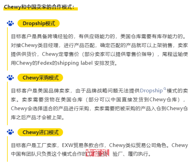 值得一提的是,今年初Chewy首次面向中國賣家開放,采用Dropship、Chewy采購、Chewy進(jìn)口三種模式。有相關(guān)業(yè)務(wù)需求的賣家,可考慮適配度。畢竟多一個銷售渠道,就是多一份收入。