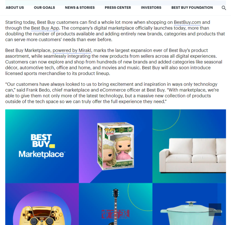 此外,百思買強調新市場將與線下店面緊密聯動:消費者可在就近門店退回第三方賣家的大部份商品,或選擇郵寄退回賣家;門店員工能為到店顧客提供線上平臺商品咨詢并協助在線上完成購物車搭建,實現線上線下一體化服務。