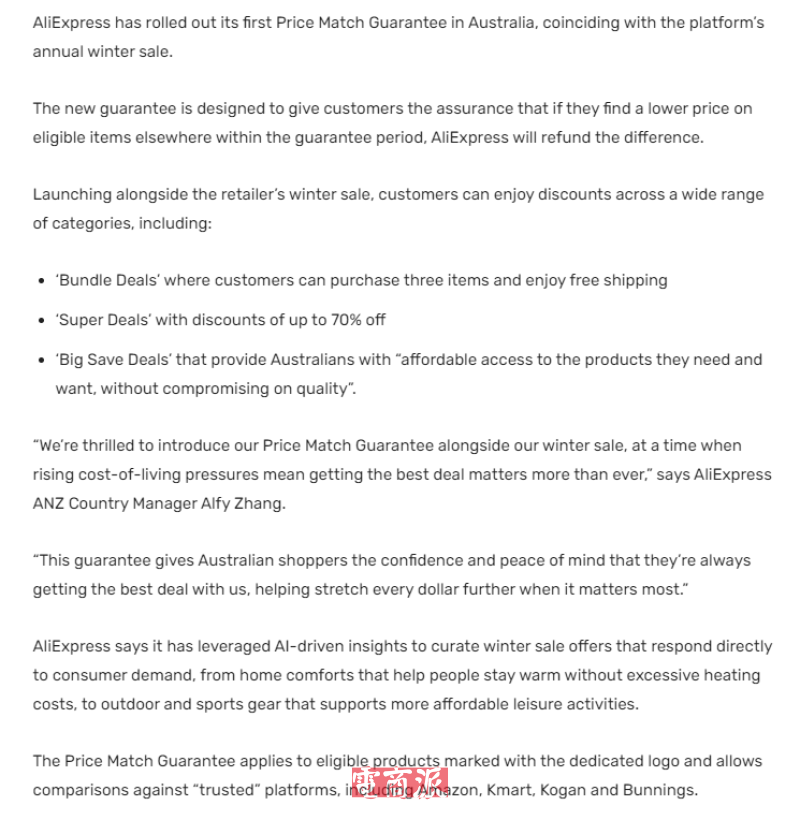 8月21日消息,速賣通在澳大利亞正式推出首個價格保障(Price Match Guarantee)服務,并與年度冬季大促活動同步上線。該舉措旨在為消費者提供價格保障,如果在保障期內發現符合條件的商品在其他平臺售價更低,速賣通將返還差價。速賣通表示,這一服務不僅能提升消費者購物體驗,也將在競爭激烈的澳大利亞電商市場中進一步增強平臺吸引力。