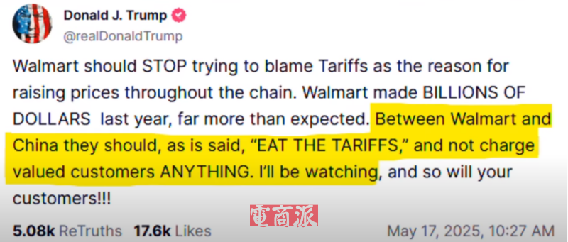 特朗普要求沃爾瑪維持原價(jià)?圖源:Truth Social