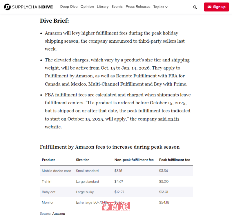 美國市場的節(jié)日履約費用則依據(jù)商品尺寸和重量分檔收取,例如,一件小型標(biāo)準(zhǔn)手機殼的非旺季費用為3.15美元,而旺季期間則為3.34美元;一件T恤的費用從4.67美元上調(diào)至5美元。對于危險品,費用增幅更高,例如重量不超過2盎司的小型標(biāo)準(zhǔn)商品,非旺季費用為4.03美元,旺季則為4.37美元,而重量超過70磅的超大件危險品費用將從54.81美元上升至59.23美元。