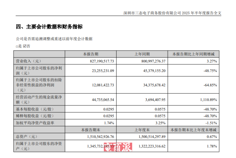 8月31日消息,三態(tài)股份近日發(fā)布了2025上半年財報。數(shù)據(jù)顯示,1-6月營收為8.27億元,同比上升3.27%;歸母凈利潤2325.52萬元,同比下降48.75%。