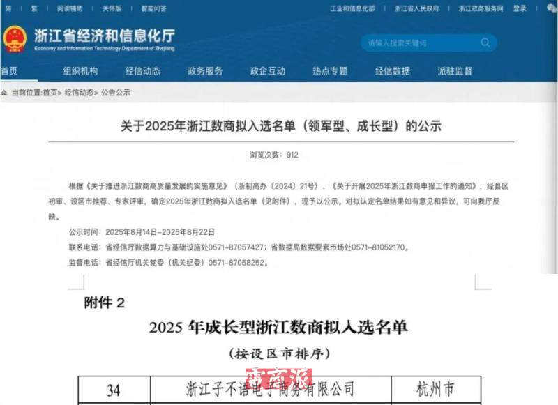 9月2日消息,浙江省經(jīng)濟和信息化廳近日正式公示《2025年浙江數(shù)商擬入選名單(領軍型、成長型)》。浙江子不語電子商務有限公司憑借企業(yè)數(shù)字化硬實力,成功獲評“2025年成長型浙江數(shù)商”。