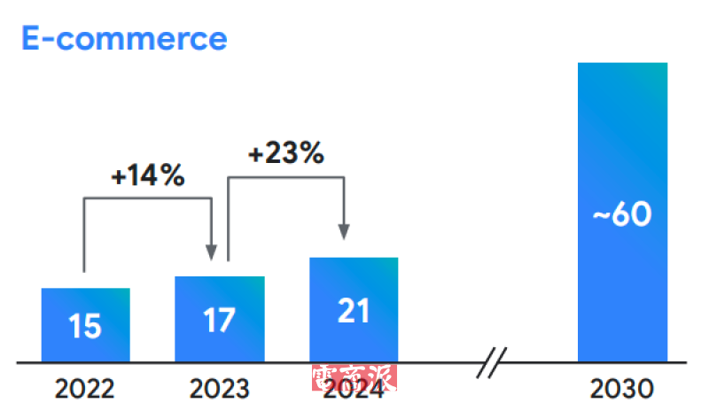 據此前谷歌、淡馬錫和貝恩公司聯合發布的2024 東南亞互聯網經濟報告“e-Conomy SEA 2024”顯示,2024年,菲律賓的數字經濟規模將達到300億美元,電商規模預計為210億美元。而到2030年,其數字經濟規模有望增至800-1500億美元,電商規模也將增至600億美元。