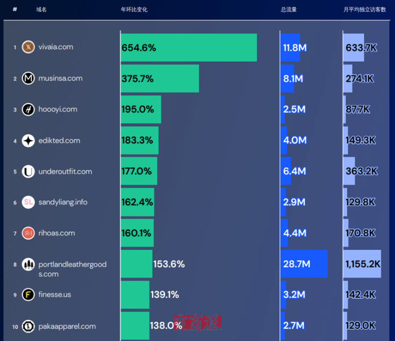 依靠舒適、時尚和環(huán)保的理念,VIVAIA女鞋在海外大殺四方,拿下美國2023年度流量增長百大網(wǎng)站排行榜(Digital 100)中服飾及配飾領(lǐng)域的流量增長第一名,增長率達(dá)654.6%,遠(yuǎn)超第二名的musinsa(增長率為375.7%)。