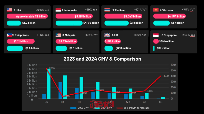 但實(shí)際結(jié)果是差距還很大。據(jù)行業(yè)媒體36氪消息,2024年抖音電商GMV總額約3.5萬(wàn)億元。據(jù)視頻商務(wù)數(shù)據(jù)分析公司Tabcut.com統(tǒng)計(jì),2024年TikTok Shop全球GMV達(dá)到約326億美元(約合人民幣2323億元)。其中,美國(guó)市場(chǎng)收入占比最高,達(dá)到約90億美元。